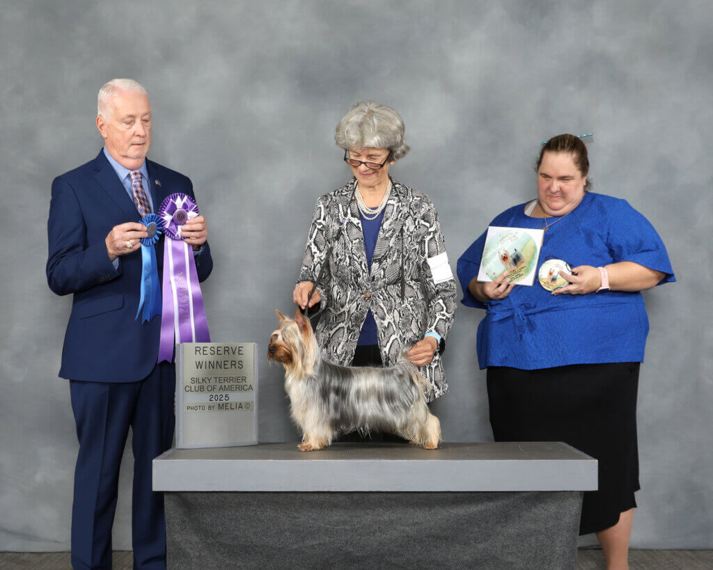 The National in 2024 was great for Tessier. We took Best in Sweeps, Best Puppy, Reserve Winners Dog, Winner Bitch and Award of Merit. In the 4 following shows after the National Tessier took Breed and Group placements each day, either with Reddi or our new Special Lennon (above in the heading and he was # 1 Silky 2024 Breed, that is, in competition with other Silky Terriers).
